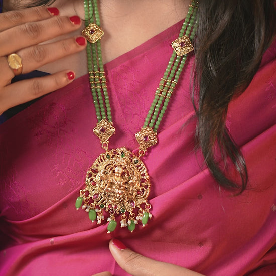 This exquisite long necklace is a beautiful blend of traditional and contemporary design. It features multiple strands of lustrous faux pearls leading down to a large, intricately detailed gold-plated pendant. The round pendant showcases a beautiful goddess Lakshmi motif, a symbol of prosperity, surrounded by a delicate floral pattern and accented with vibrant red and green stones. The set includes a matching pair of elegant earrings. This piece is perfect for festive occasions, weddings, or traditional events, adding a touch of grace and opulence to any ethnic attire.