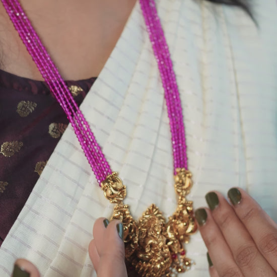 Ruby Bead Strands: Four rows of vibrant ruby-pink beads that give the necklace a graceful fall and a regal pop of colour.