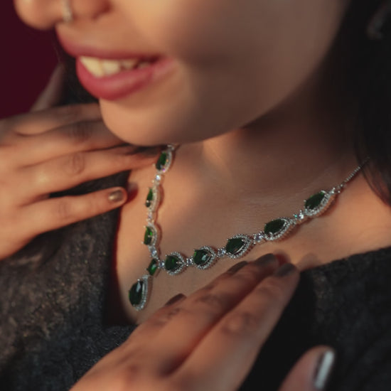Emerald Droplet Necklace: A stunning row of teardrop-shaped emerald-green stones, each framed with precision-cut crystals that shimmer under every light.