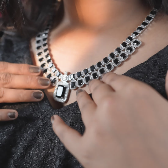 Noir Elegance Necklace: A dual-layered design featuring alternating rows of jet-black baguette stones, encased in glimmering crystal borders for a bold yet refined finish.